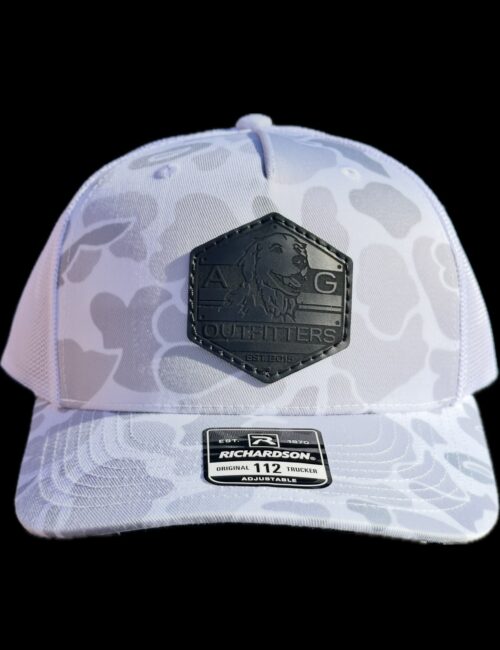 AG Outfitters Golden Retriever Black Leather Richardson 112PFP Trucker Hat Blizzard Duck Camo