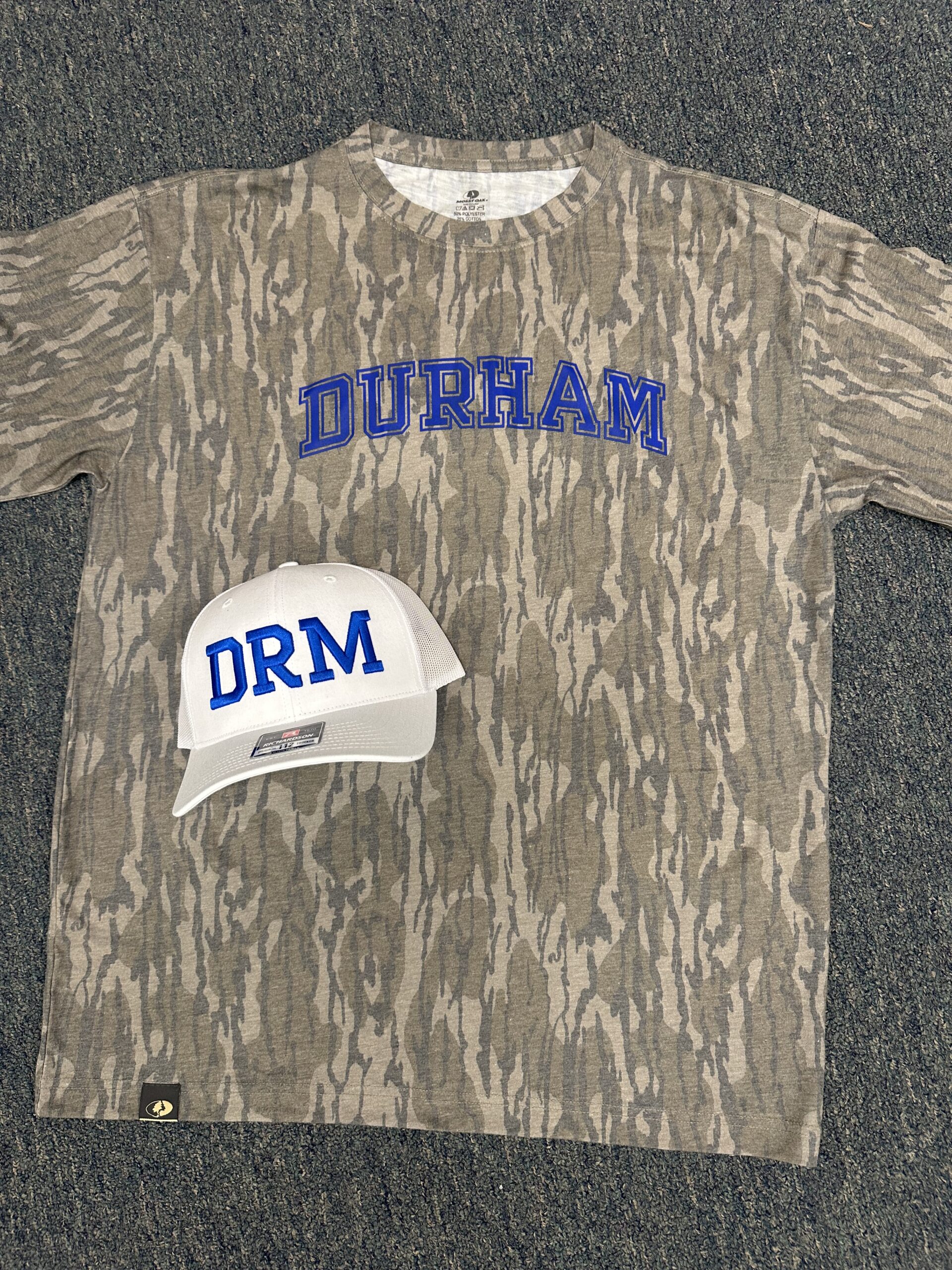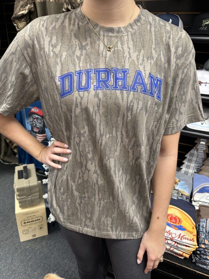 Durham Collegiate Font Mossy Oak Short Sleeve T-Shirt Unisex Bottomland Camo