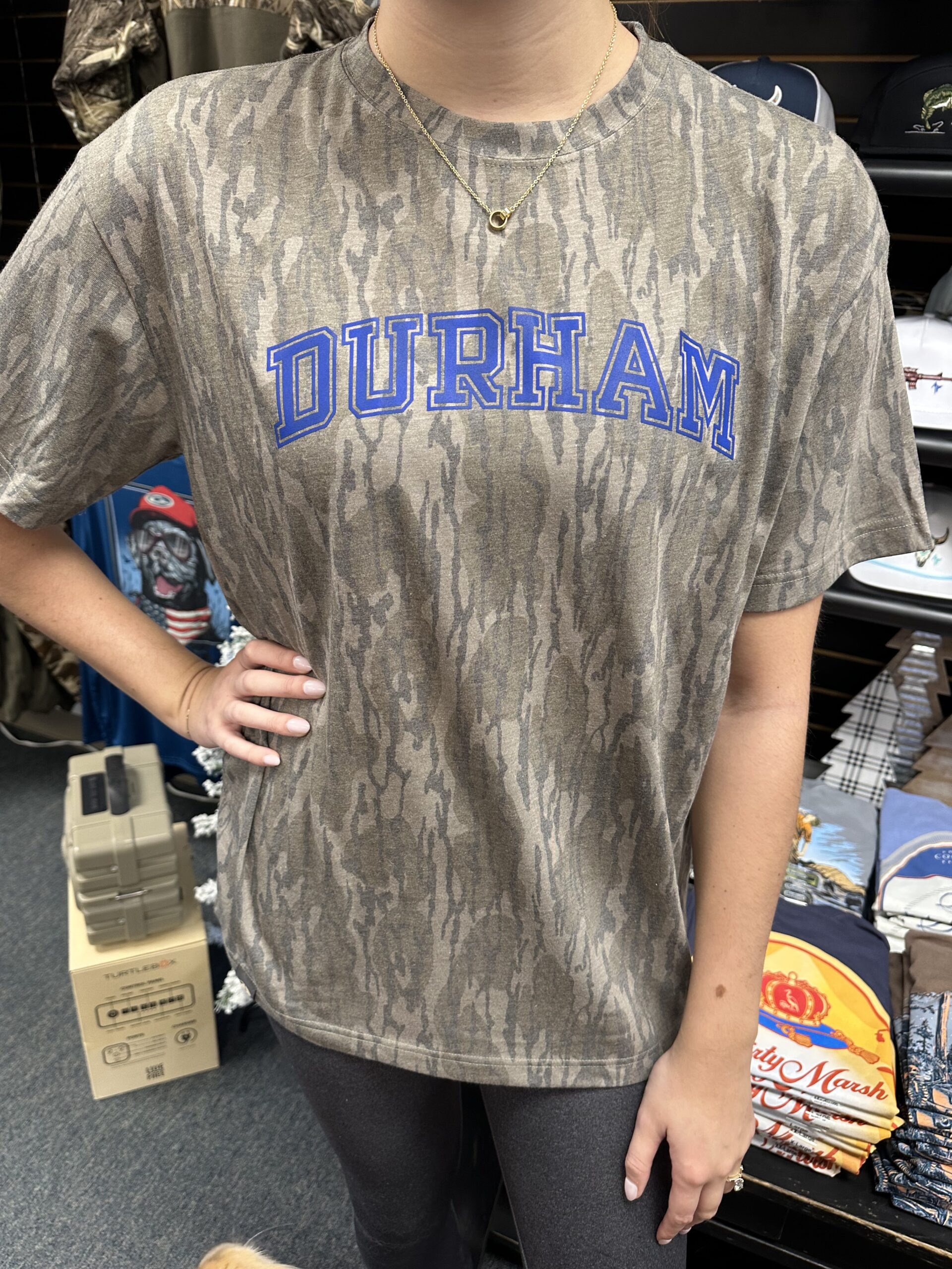 Durham, North CarolinaDurham NC Script Mossy Oak Short Sleeve T-Shirt Unisex Bottomland Camo